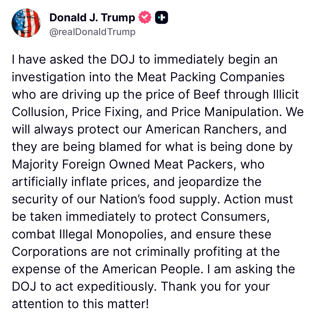 Today, President Donald J. Trump directed the Department of Justice to launch an investigation into the nation’s largest meat packing companies for potential collusion, price fixing, and price manipulation. This decisive action targets the foreign-dominated conglomerates that control America’s meat supply and have been accused of artificially inflating prices at the expense of farmers, ranchers, and working families.